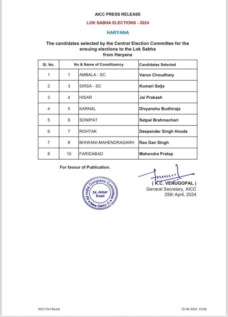 सिरसा से सैलजा और रोहतक से दीपेंद्र हुड्डा मैदान में, कांग्रेस ने  जारी की लिस्ट