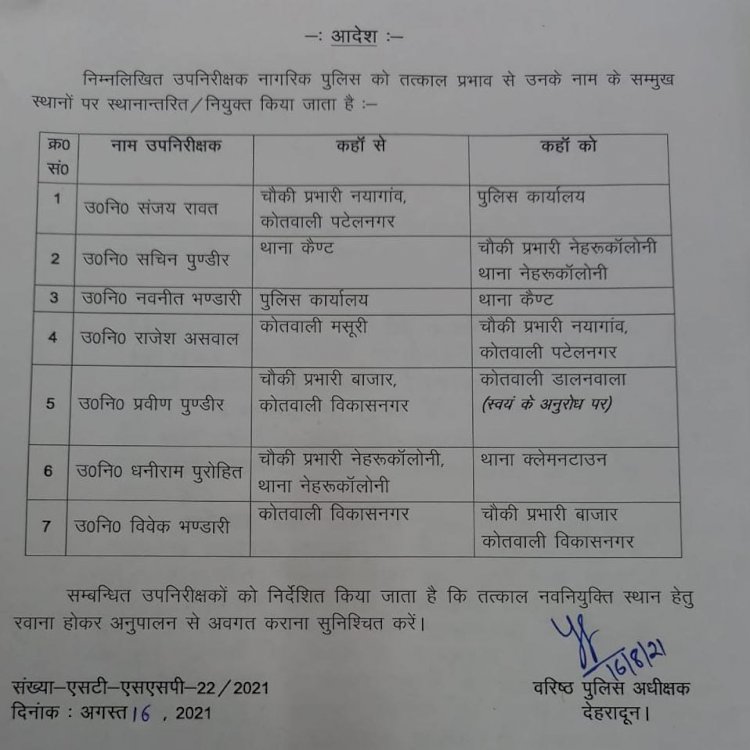 देहरादून: एसएसपी ने किए 7 सब इंसपेक्टर्स के ट्रांसफर, पढ़ें लिस्ट
